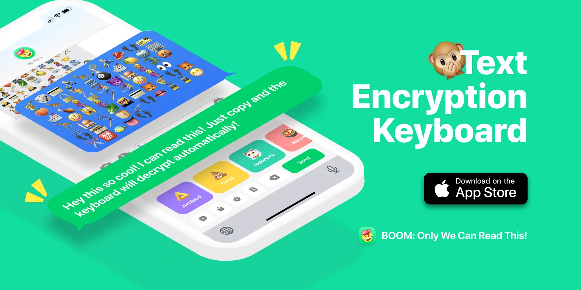 BOOM is a text encryption keyboard. Without any limitation to any specific app, BOOM can encrypt your texts, chat messages or articles anywhere as long as there is an input box. It can also do some cool tricks like jumbled text. BOOM can also decrypt encrypted texts within the keyboard.